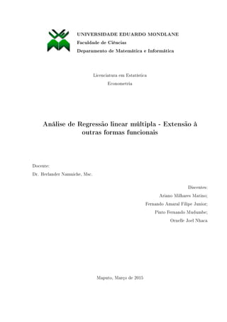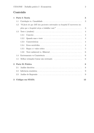1. O documento apresenta uma introdução à estatística e econometria, abordando conceitos como correlação, casualidade, teste t de Student e regressão linear múltipla.