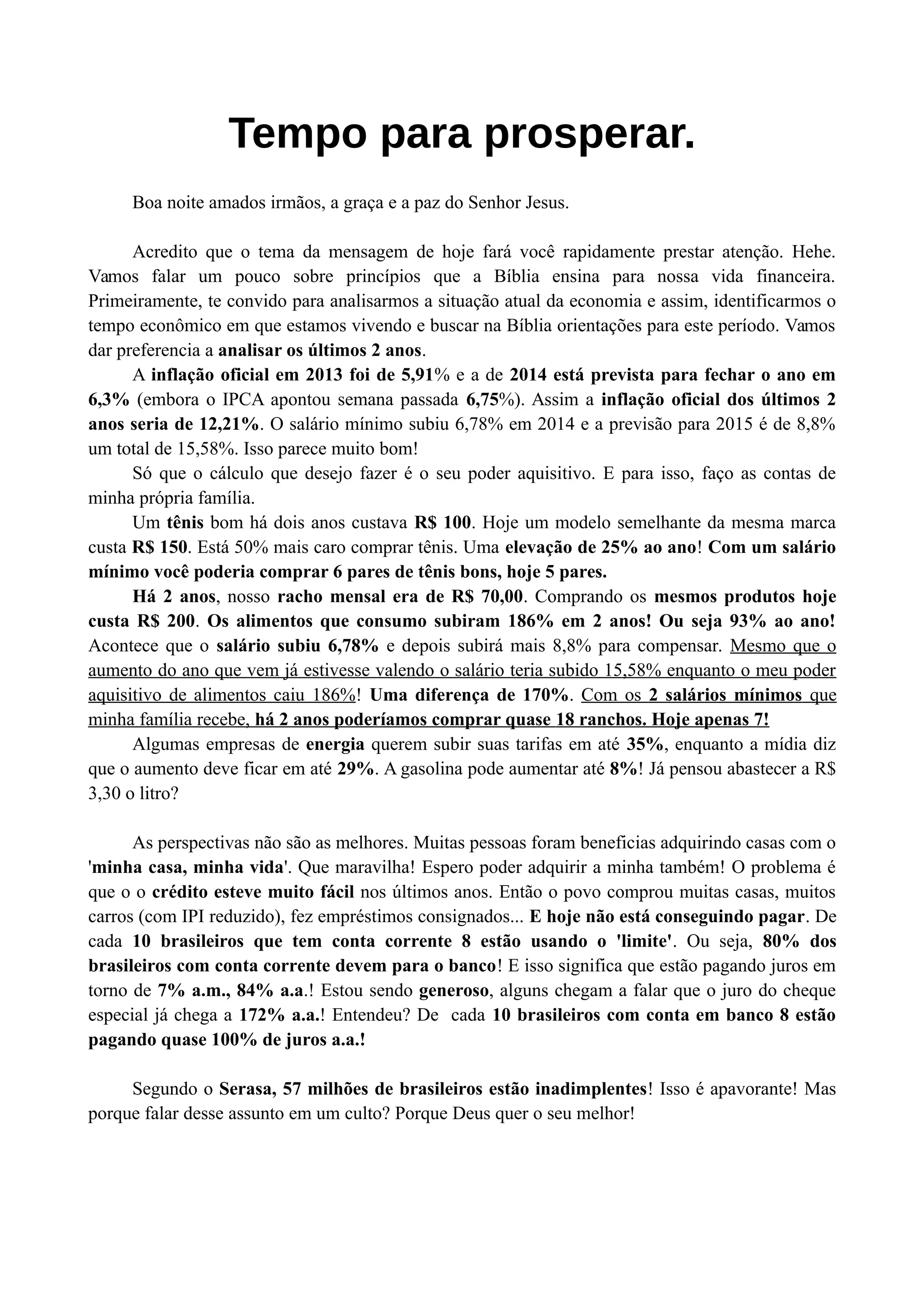 O documento aborda a situação econômica atual, destacando a inflação e a perda do poder aquisitivo das famílias brasileiras nos últimos anos. O texto sugere princípios bíblicos para a gestão financeira, incluindo a eliminação de supérfluos, a união das finanças do casal e a prática de dízimos e ofertas. A mensagem conclui com um apelo à oração e à reflexão espiritual sobre o uso adequado dos recursos.