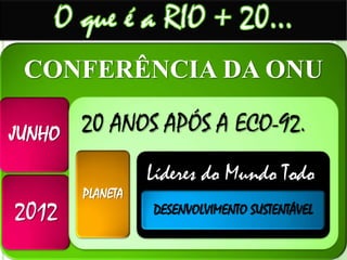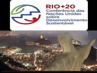 O documento discute a conferência da ONU de 2012 sobre desenvolvimento sustentável 20 anos após a Eco-92. Aborda os conceitos de desenvolvimento sustentável e economia verde e azul, além de destacar o Jardim Gramacho como maior aterro sanitário do mundo que será desativado em maio de 2012.