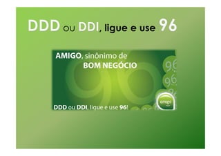 O documento divulga uma promoção de tarifas reduzidas para chamadas fixo-fixo na Grande São Paulo, com preços de até R$ 0,25. Para participar, é necessário realizar um cadastro. A promoção pode ser acessada através do número 103 96.
