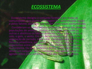 Este documento fornece um resumo de ecossistemas, cadeias alimentares e biomas. Define ecossistema como o conjunto de comunidades que interagem em uma região e com fatores ambientais. Descreve que cadeias alimentares transferem matéria e energia entre produtores, consumidores e decompositores. Lista exemplos de biomas como florestas tropicais, temperadas e de mangue.