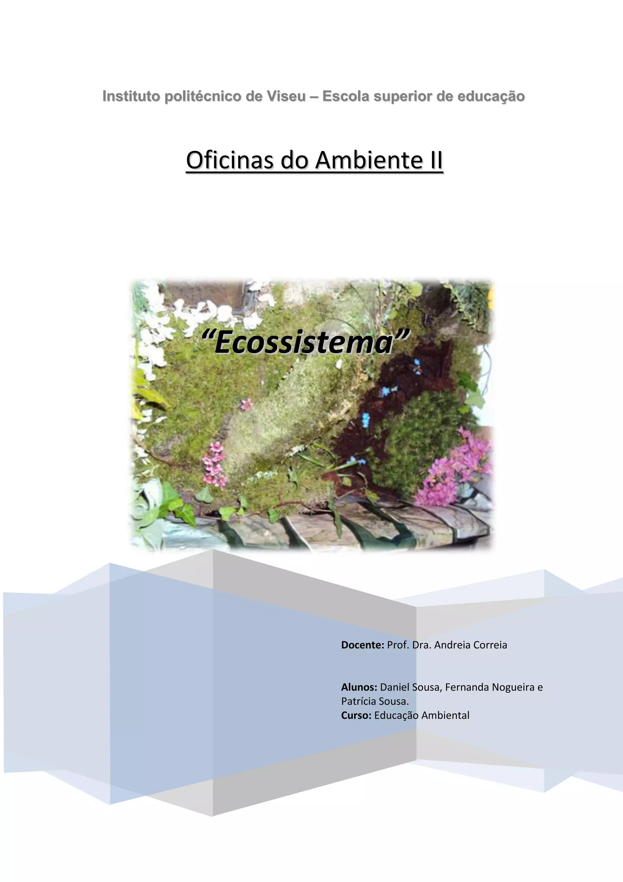 Este documento descreve um ecossistema simulado em uma caixa de papelão que inclui várias espécies de plantas e animais, como carvalho, musgos, salamandras, caracóis e mosquitos. Ele explica as relações entre as espécies, incluindo mutualismo, predação e competição, e fornece detalhes taxonômicos sobre cada espécie, como seu reino, classe, ordem e outros.
