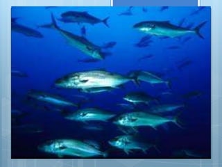 O documento descreve os principais componentes de um ecossistema aquático, incluindo o fitoplâncton que realiza a maior parte da fotossíntese, servindo de base para as cadeias alimentares. Ele também discute o plâncton, incluindo o fitoplâncton e o zooplâncton, e outros grupos como o necton, composto por animais que nadam ativamente, e o bentos, composto por organismos fixos ou móveis no fundo aquático.