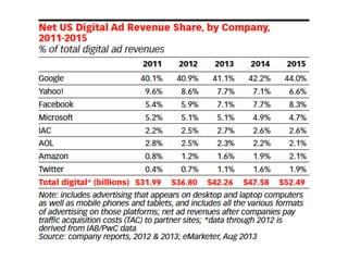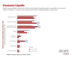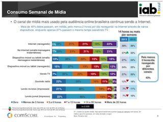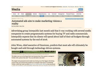 O documento discute a evolução da publicidade em um ecossistema maximídia, ressaltando a transição da arte para a ciência na persuasão e a crescente escassez de atenção no mundo digital. Além disso, aborda a importância de dados na otimização de investimentos publicitários e os desafios enfrentados pela internet no Brasil em termos de legislação e qualificação profissional. A análise sugere que organismos da economia de redes são mais eficientes na captura e distribuição da atenção do que os da economia de escala.