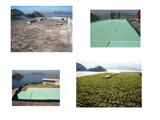 O documento apresenta sete motivos para a instalação de sistemas ecotelhados: 1) absorção da água da chuva e radiação solar; 2) redução de gastos de energia; 3) conforto térmico e acústico. Apresenta também diferentes tipos de sistemas ecotelhados e exemplos de projetos realizados no Rio de Janeiro e em outras cidades.