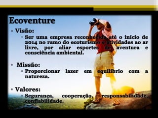 A Ecoventure é uma empresa de ecoturismo e esportes de aventura com sede em Vila Velha, ES. A empresa tem como diferencial oferecer roteiros personalizados com diversas atividades em diferentes locais do estado. O time gerencial é formado por jovens profissionais com experiência no ramo e educação superior. O principal investimento será em equipamentos de alta qualidade.