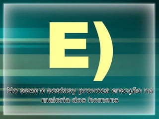 O documento discute o ecstasy, uma droga fabricada a partir do MDMA em 1912. Ele descreve como o ecstasy é ingerido, os diferentes tipos de comprimidos, e os efeitos físicos e riscos à saúde, incluindo hipertermia, intoxicação e danos cerebrais permanentes com o vício.