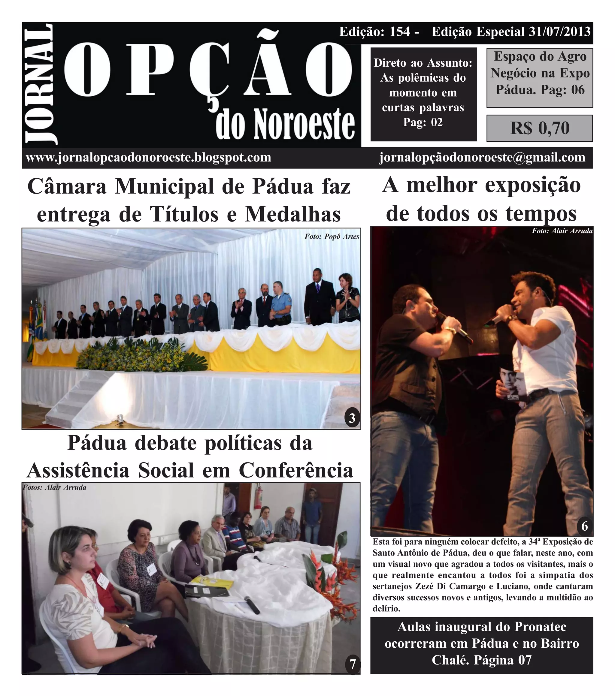 A Câmara Municipal de Pádua realizou uma Sessão Solene para comemorar 131 anos da emancipação político-administrativa do município e homenagear personalidades. Foram entregues títulos e medalhas, incluindo a Medalha Visconde Figueira ao Dr. Fernando Perlingeiro Lavaquial. A 34a Exposição de Pádua foi um sucesso com recorde de público e novas atrações, sendo considerada a melhor de todos os tempos pelos visitantes.