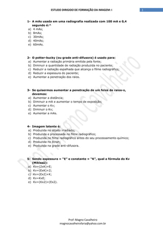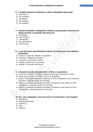 O documento apresenta um teste de múltipla escolha sobre formação de imagem em radiografia, abordando conceitos como mAs, Kv, densidade óptica, contraste, poder de penetração, entre outros. O teste contém 32 questões com gabarito no final.