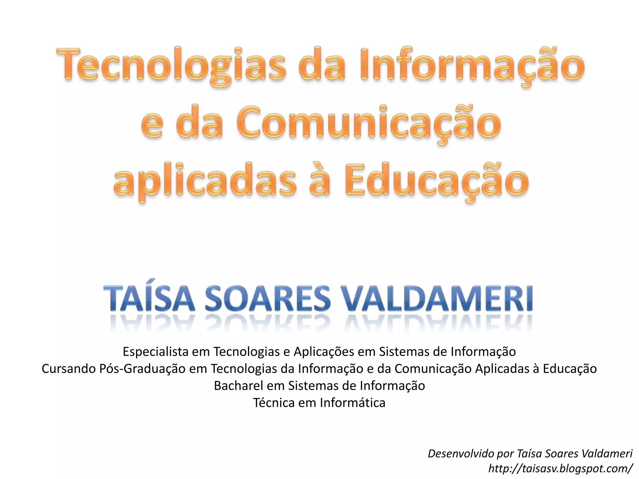 O documento discute as tecnologias da informação e comunicação aplicadas à educação. Apresenta conceitos fundamentais como informática na educação, educação a distância e ambientes virtuais de aprendizagem. Fornece exemplos de objetos de aprendizagem, sites educativos e softwares para educação infantil.