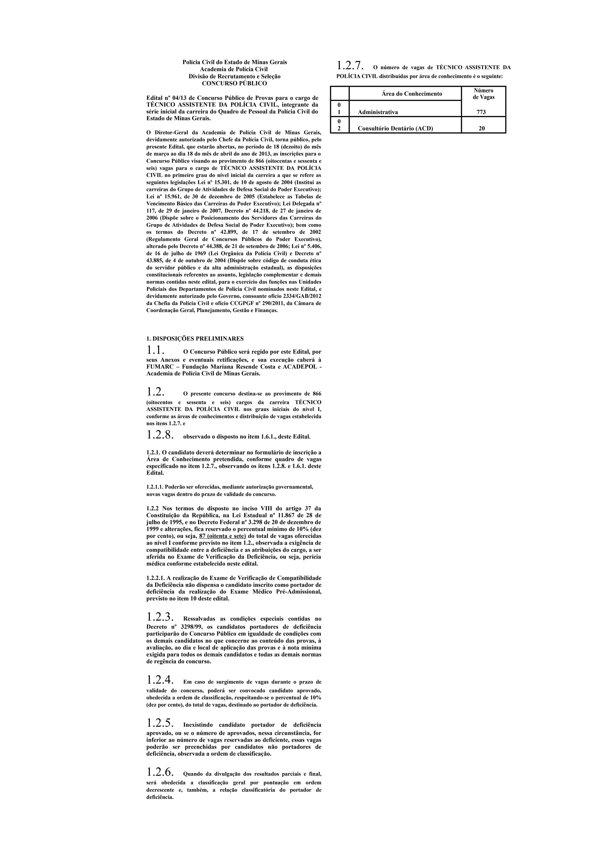 Este documento descreve um edital de concurso público para o cargo de Técnico Assistente da Polícia Civil em Minas Gerais, oferecendo 866 vagas distribuídas por áreas de conhecimento e órgãos/departamentos. 10% das vagas são reservadas para pessoas com deficiência.