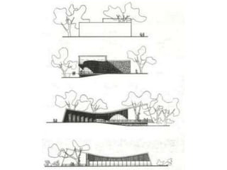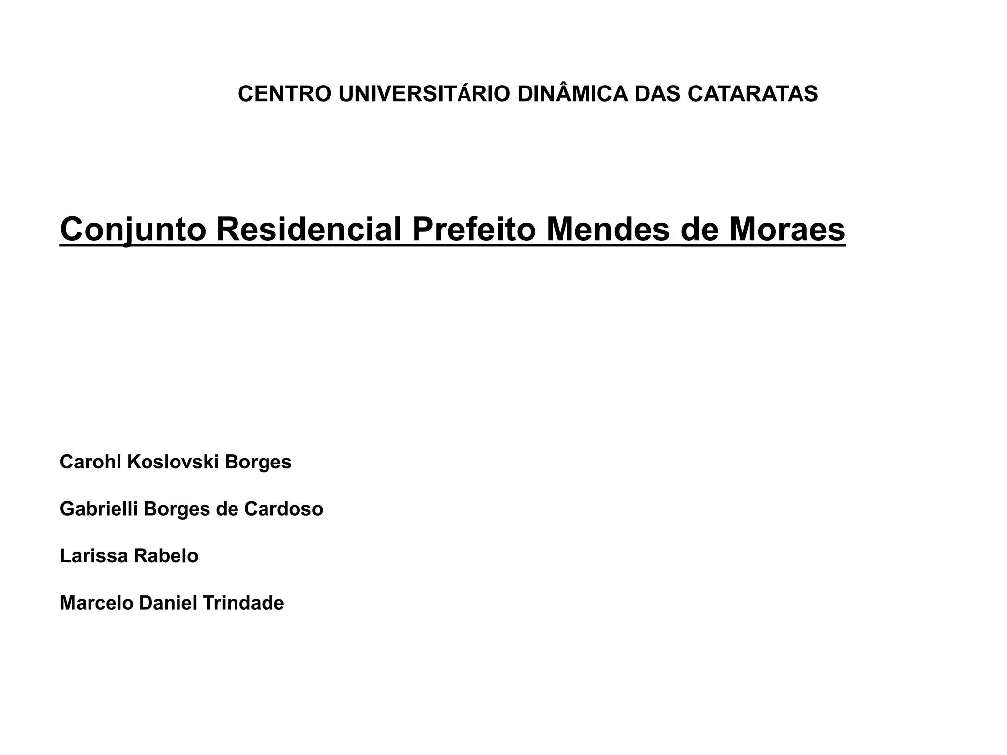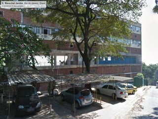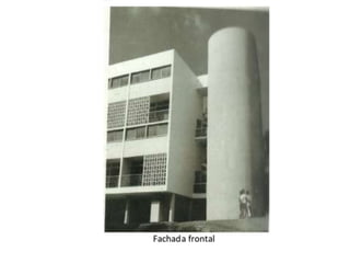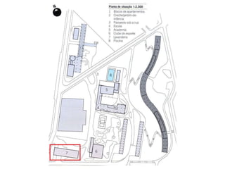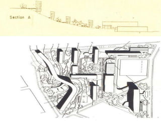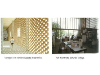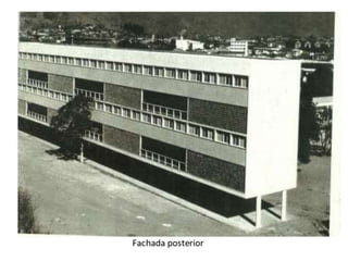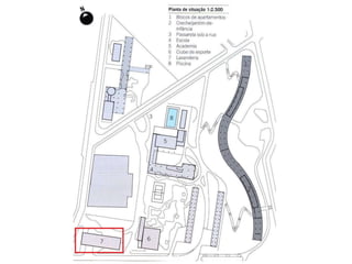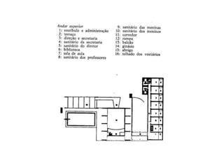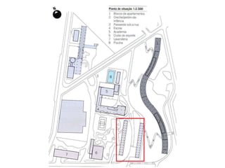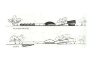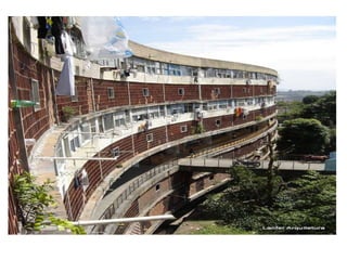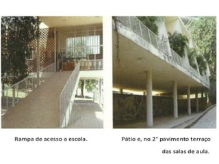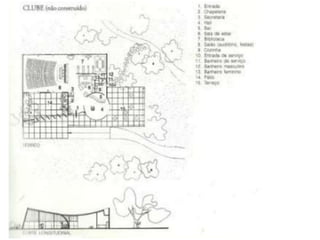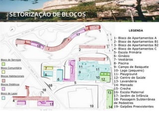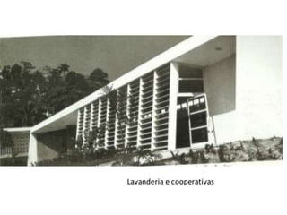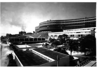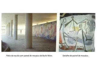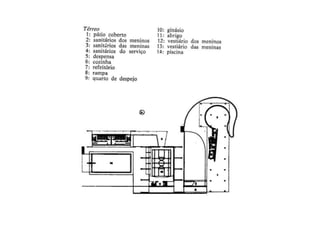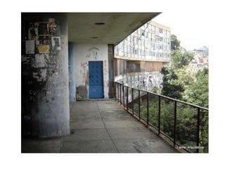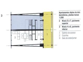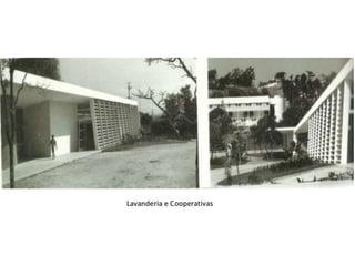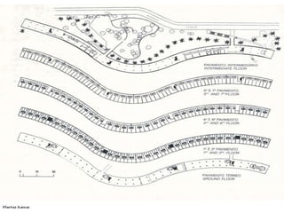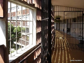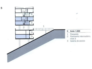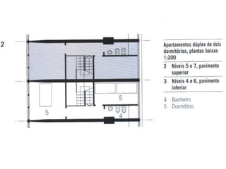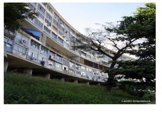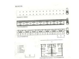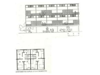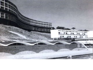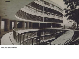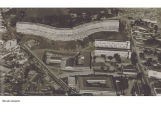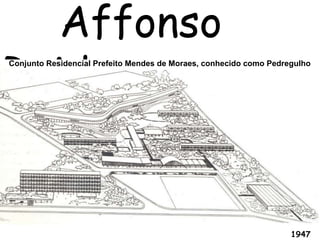 O documento apresenta o conjunto residencial Prefeito Mendes de Moraes, projetado por Affonso Reidy e com paisagismo de Roberto Burle Marx. Composto por 272 unidades habitacionais, o projeto inclui diversas tipologias de apartamentos e equipamentos comunitários como escolas e quadras esportivas. Localizado no Morro do Pedregulho, no Rio de Janeiro, o edifício destaca-se pela sua estrutura em concreto e arte de artistas renomados.