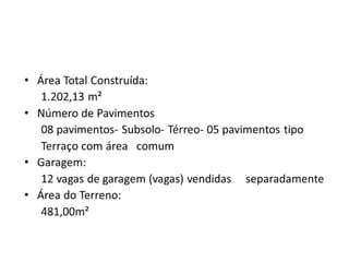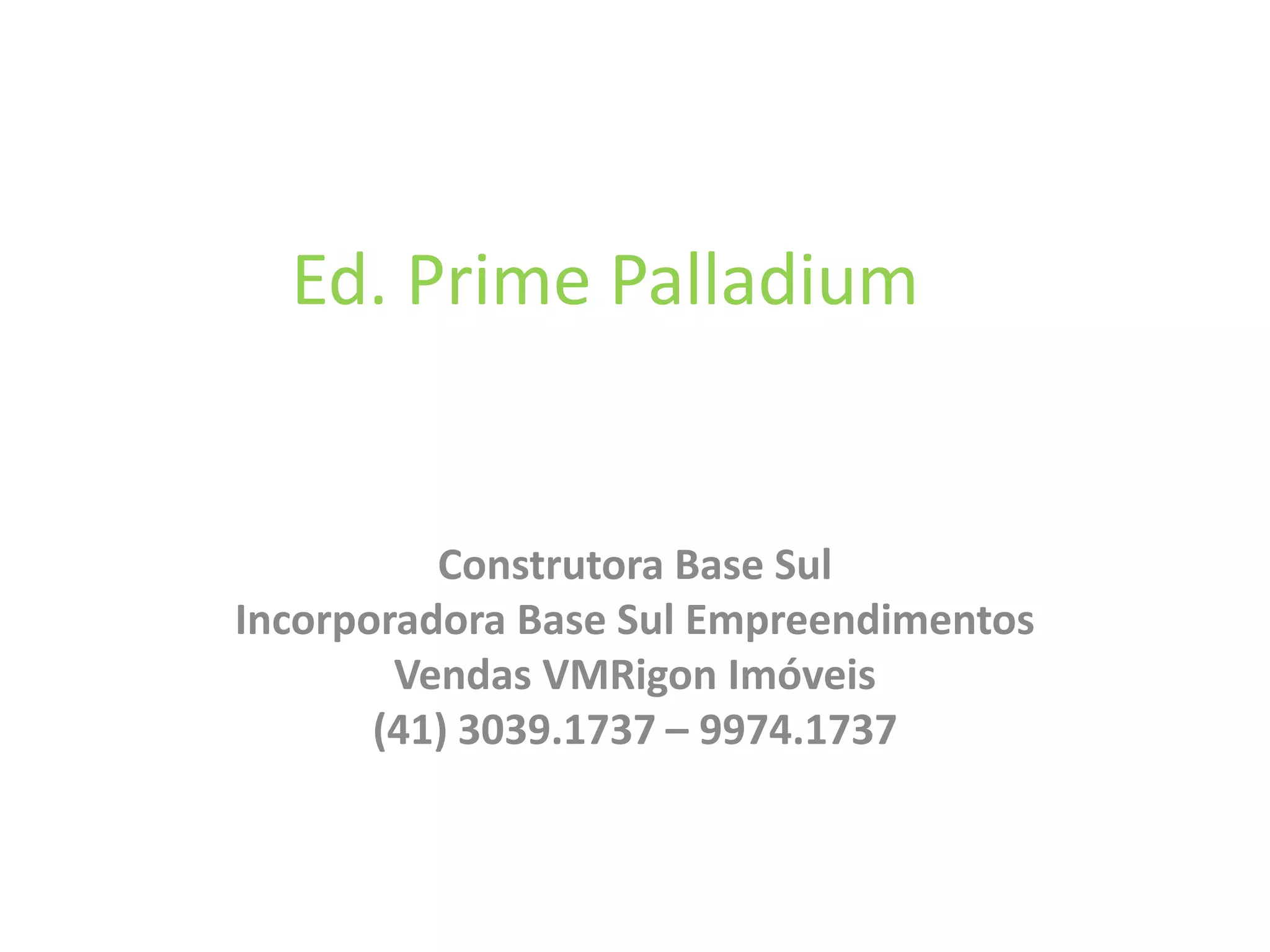 O documento descreve o empreendimento residencial Ed. Prime Palladium localizado na Rua Serafim França, próximo ao Shopping Palladium em Curitiba. O prédio terá 01 torre com 08 andares e 36 unidades de 1 a 4 dormitórios entre 25 e 31 metros quadrados. Detalha também a construtora, incorporadora e imobiliária responsáveis pela venda das unidades do empreendimento.