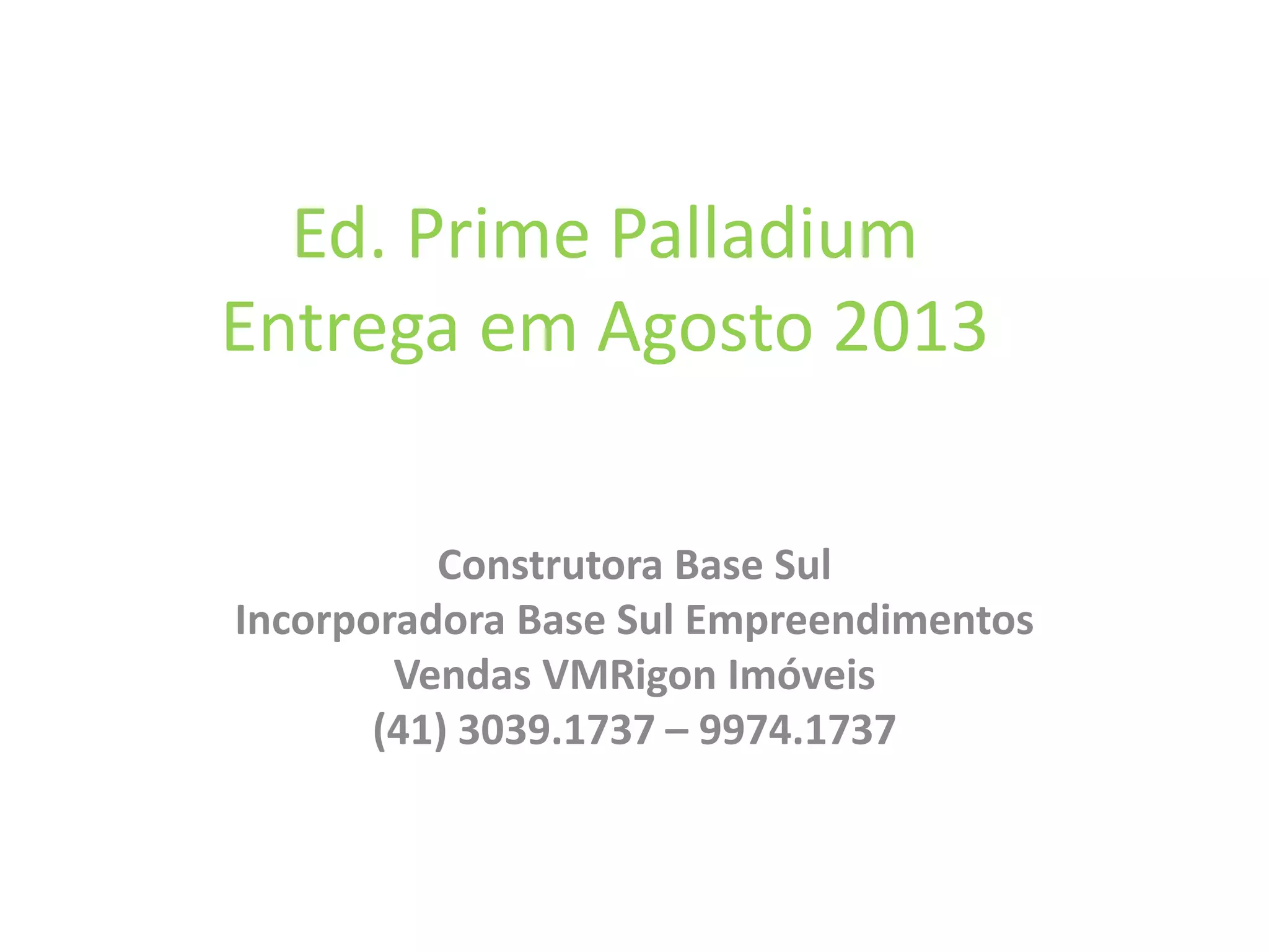 Este documento descreve o empreendimento residencial Ed. Prime Palladium, localizado na Rua Serafim França, Bairro Portão em Curitiba. O prédio terá 08 andares e 36 unidades distribuídas em 04 tipos, com áreas entre 25m2 e 31m2. A construtora é a Base Sul e as vendas são feitas pela imobiliária VMRigon Imóveis.
