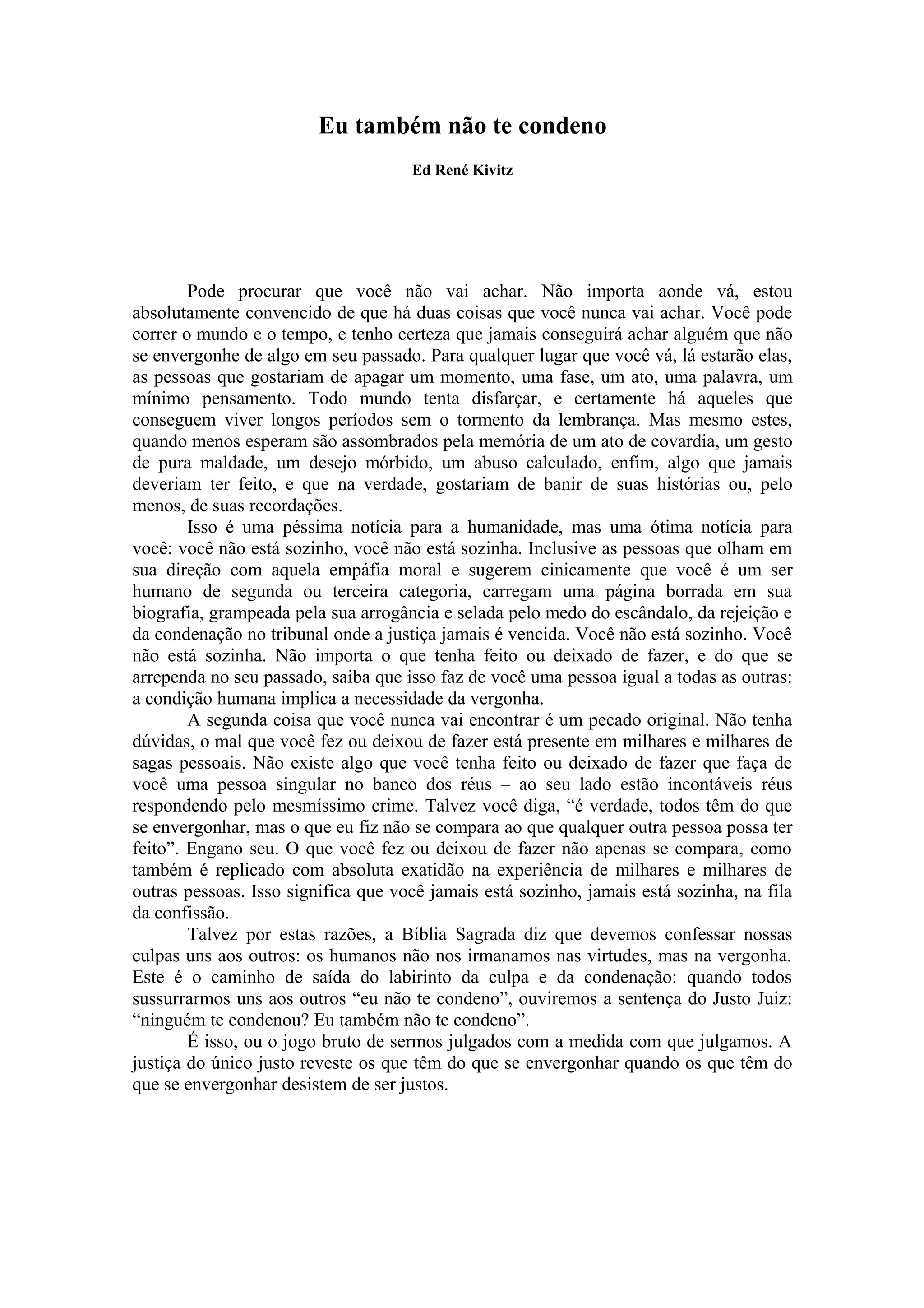 O documento discute como todos os seres humanos têm algo em seu passado do qual se envergonham e que gostariam de apagar. Ninguém está livre de culpa ou pecado, e o que cada um fez de errado foi replicado milhares de vezes na experiência de outras pessoas. Ao invés de condenar uns aos outros, devemos confessar nossas falhas mutuamente, pois só assim alcançaremos a misericórdia divina.