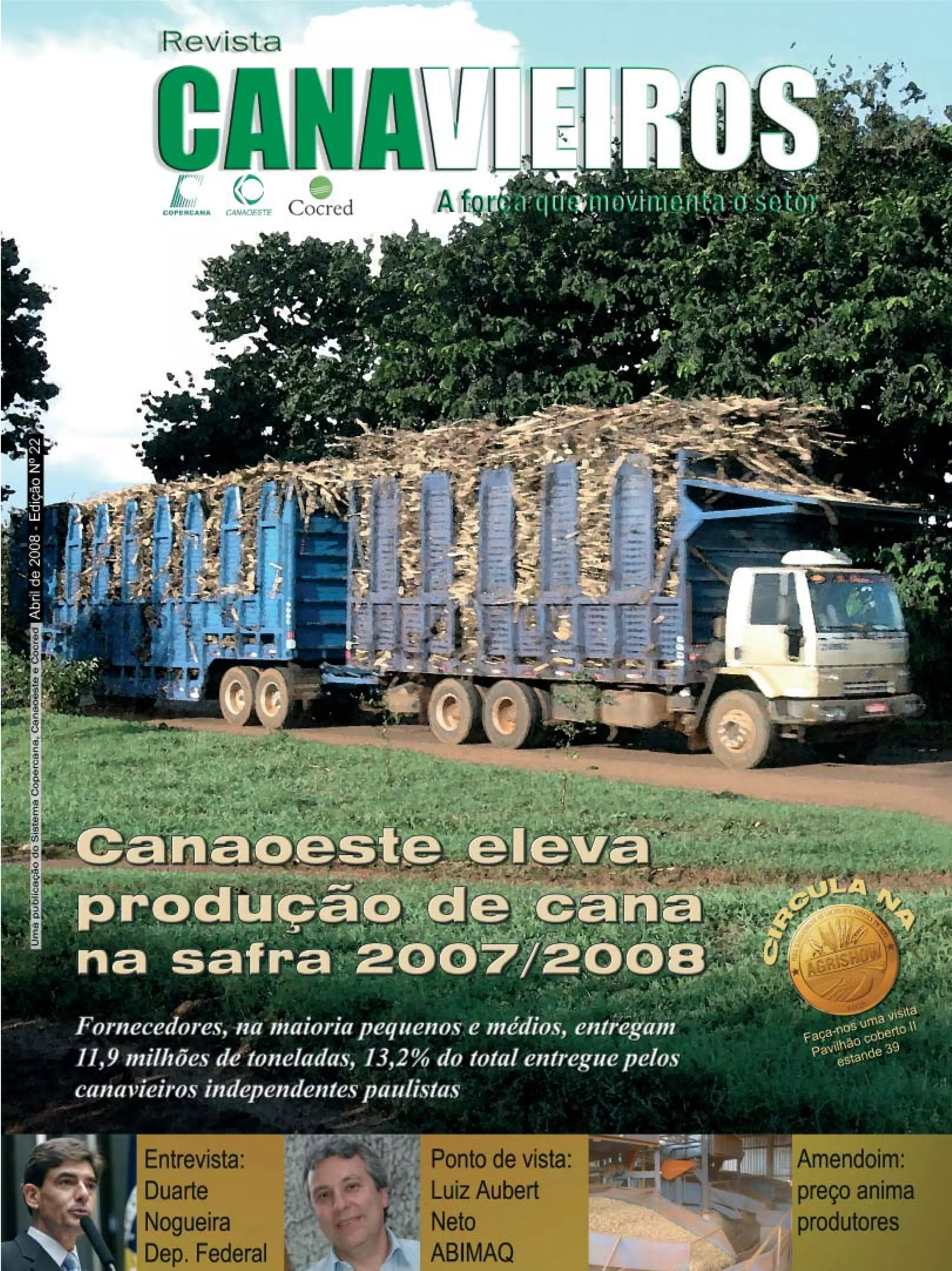 O documento é a edição de Abril de 2008 da Revista Canavieiros. Ele destaca que os fornecedores da Canaoeste entregaram 11,9 milhões de toneladas de cana na última safra, um aumento de 7% em relação ao período anterior. O documento também apresenta uma entrevista com o deputado federal Duarte Nogueira sobre a carga tributária no agronegócio e as falhas do Programa Nacional de Biodiesel.