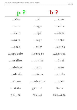 Este documento contém 16 fichas com palavras semelhantes foneticamente que podem causar confusão na escrita. Cada ficha apresenta pares de palavras que diferem em apenas um fonema como p/b, t/d, c/g, v/f, ch/j. O objetivo é trabalhar a diferenciação desses fonemas semelhantes para melhorar a escrita.