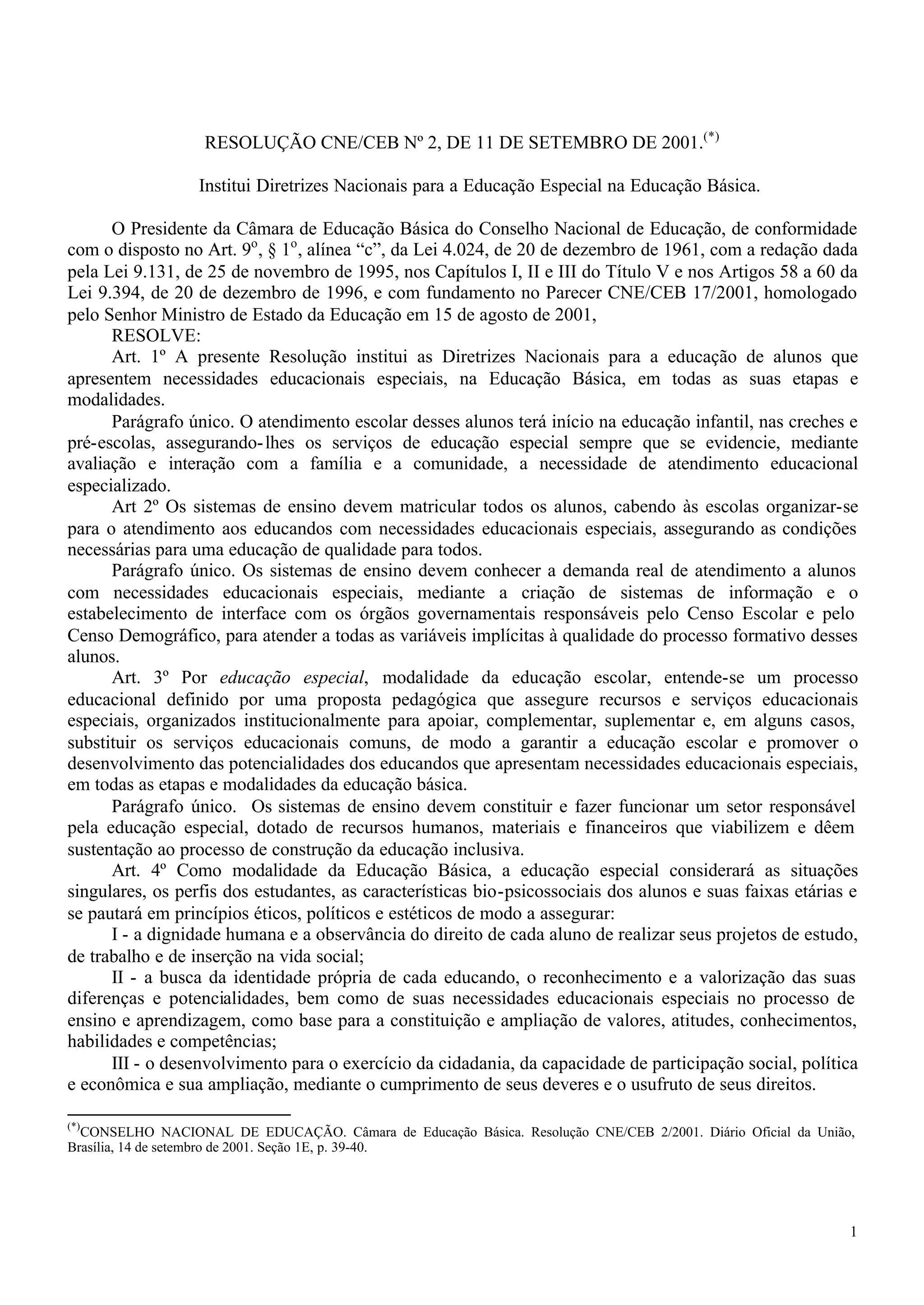 Esta resolução estabelece diretrizes nacionais para a educação especial na educação básica no Brasil. Ela determina que todos os alunos com necessidades educacionais especiais devem ser matriculados e receber atendimento em classes regulares sempre que possível, com apoio de professores especializados. A resolução também permite a criação de classes e escolas especiais temporárias ou permanentes em casos em que as necessidades do aluno sejam muito complexas para serem atendidas em classes regulares.