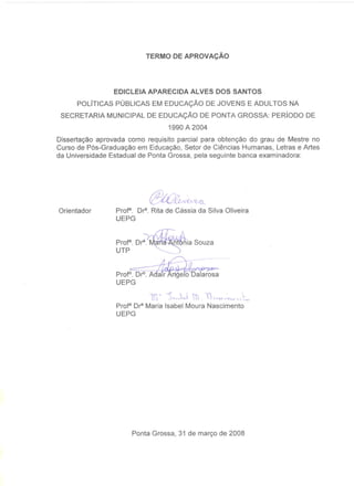 Este documento discute as políticas públicas de educação de jovens e adultos na Secretaria Municipal de Educação de Ponta Grossa no período de 1990 a 2004. Ele apresenta uma revisão da literatura sobre o tema e analisa as iniciativas federais, estaduais e municipais de EJA durante este período. O documento também inclui entrevistas com secretários municipais de educação para compreender as parcerias e desafios enfrentados na implementação de programas de EJA em Ponta Grossa.