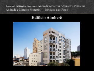 O edifício residencial Aimberê foi projetado pelos arquitetos Vinicius Andrade e Marcelo Morettin em São Paulo em 2005-2008. Com 9 andares e 3.685 m2 de área construída, o prédio se insere delicadamente na quadra com um amplo jardim de entrada e variação nas unidades. Sua volumetria e circulação vertical e horizontal foram pensadas para aproveitar ao máximo o terreno no meio da quadra.