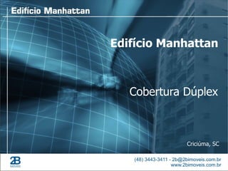 O documento descreve uma cobertura duplex localizada no Edifício Manhattan em Criciúma, SC. A cobertura tem 499,19m2 com três quartos, sala de estar, sacada e piscina privativa no piso superior. O condomínio oferece instalações como quadra poliesportiva e piscina.