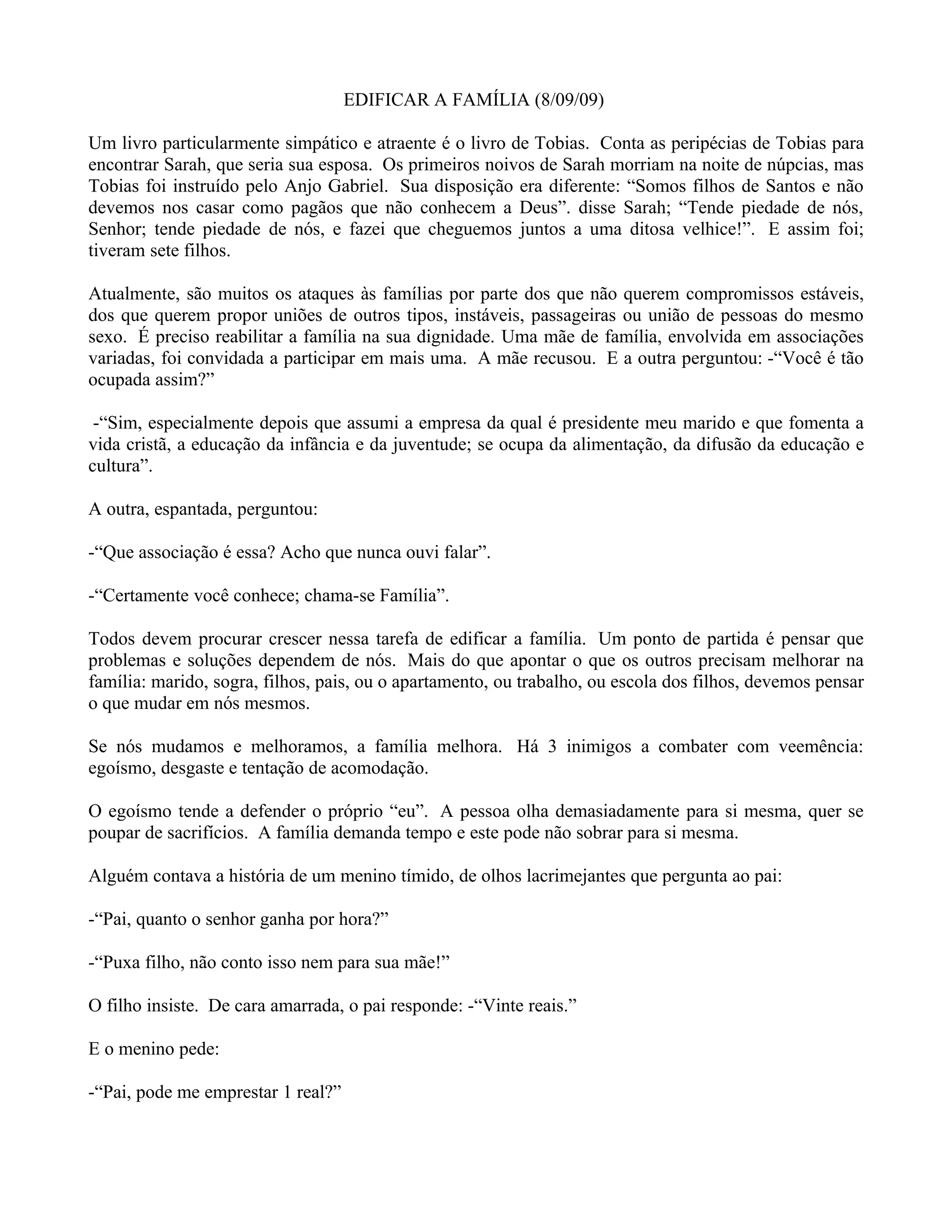 O documento discute a importância da família e como construí-la de forma sólida. Aponta três inimigos a serem combatidos: egoísmo, desgaste e acomodação. Também destaca virtudes importantes para as relações familiares como compreensão, generosidade e renúncia.