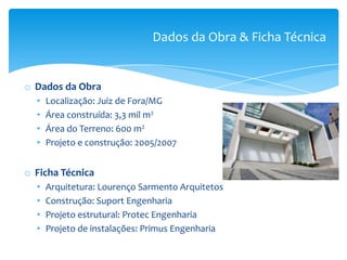 O documento descreve o projeto do Edifício Marioca localizado em Juiz de Fora, MG. Foi projetado entre 2005-2007 e contém 3.3 mil m2 de área construída em um terreno de 600 m2. O edifício possui seis apartamentos de 260m2 e uma cobertura dúplex, buscando flexibilidade e elegância estética através de sua arquitetura.