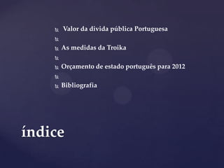 Este documento discute a dívida pública portuguesa, as medidas da Troika para Portugal e o orçamento do estado português para 2012. A dívida total de Portugal aumentou significativamente entre 2009 e 2011. A Troika está pressionando por mais cortes de gastos para reduzir o déficit. O orçamento de 2012 precisa cortar o déficit para 4,5% e envolverá reduções significativas nos gastos do governo.