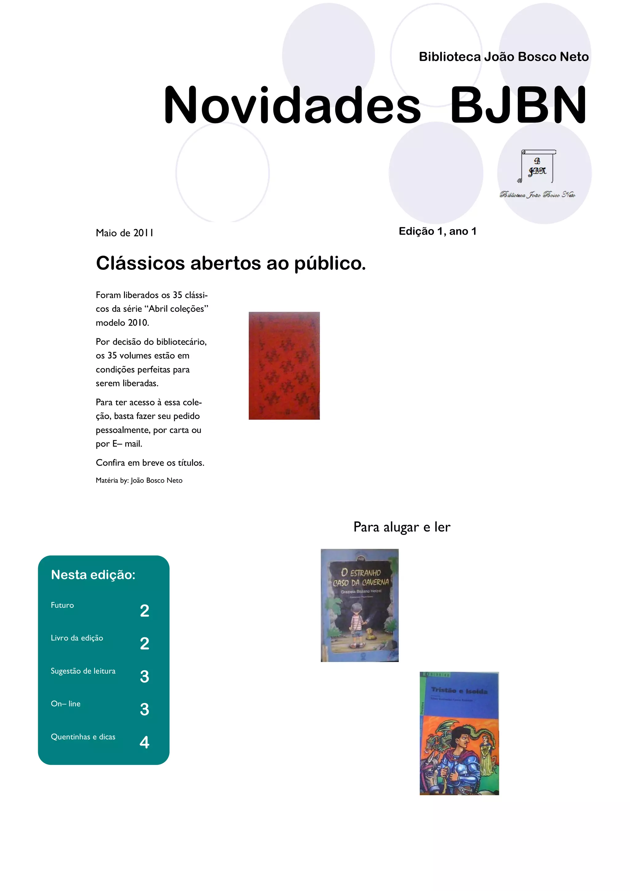 Este documento fornece informações sobre novidades e eventos na Biblioteca João Bosco Neto. Uma série de livros clássicos foi liberada para o público ler. Também discute a possível liberação da série "Percy Jackson e os Olimpianos" e fornece dicas de leitura e endereços de livrarias.