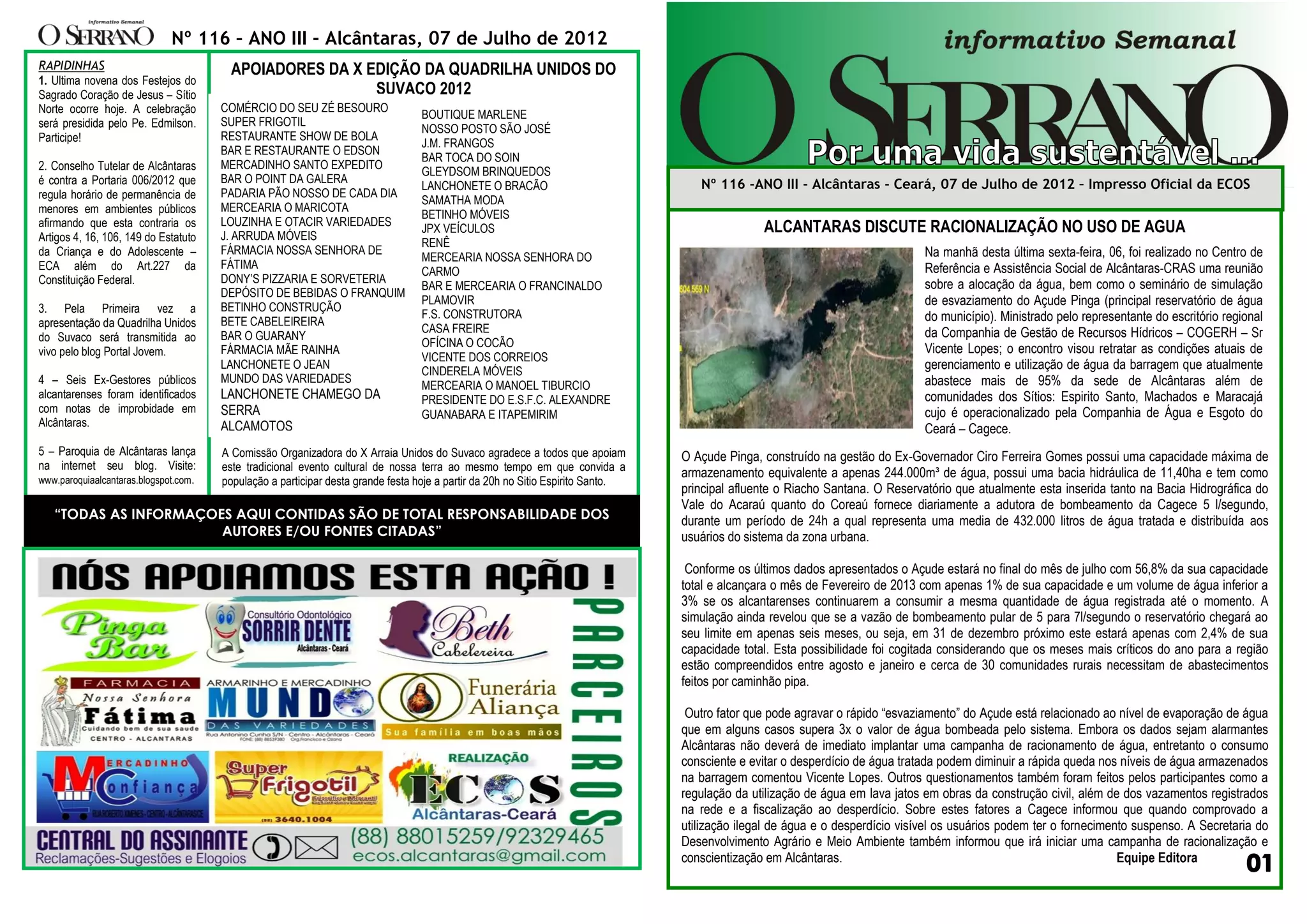 1) A reunião discutiu a racionalização no uso da água do Açude Pinga, principal reservatório do município de Alcântaras.