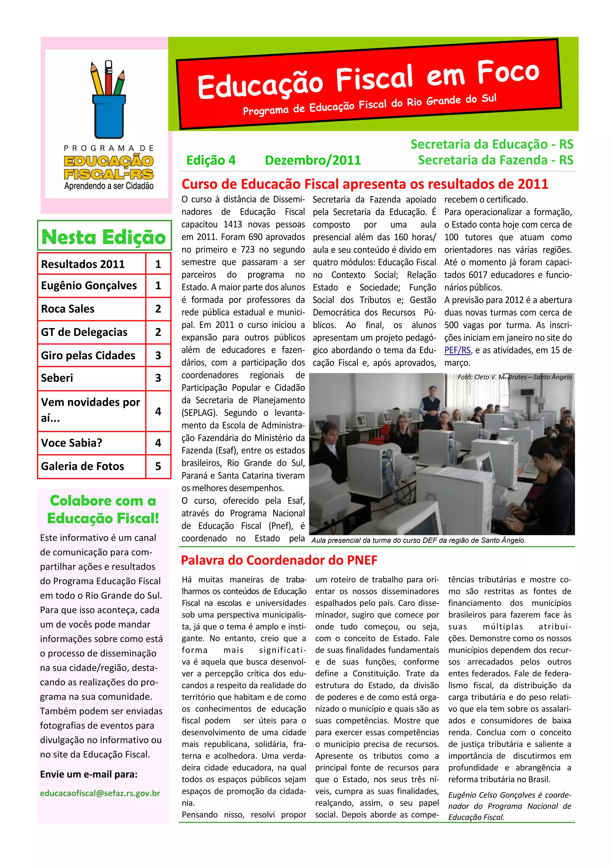 O curso de Educação Fiscal capacitou mais de 1.400 pessoas em 2011 no Rio Grande do Sul. O programa é coordenado pelas secretarias da Fazenda e Educação e capacita professores, funcionários públicos e outros grupos sobre tributos e gestão democrática de recursos públicos. A previsão para 2012 é expandir o curso para mais 500 pessoas por turma.