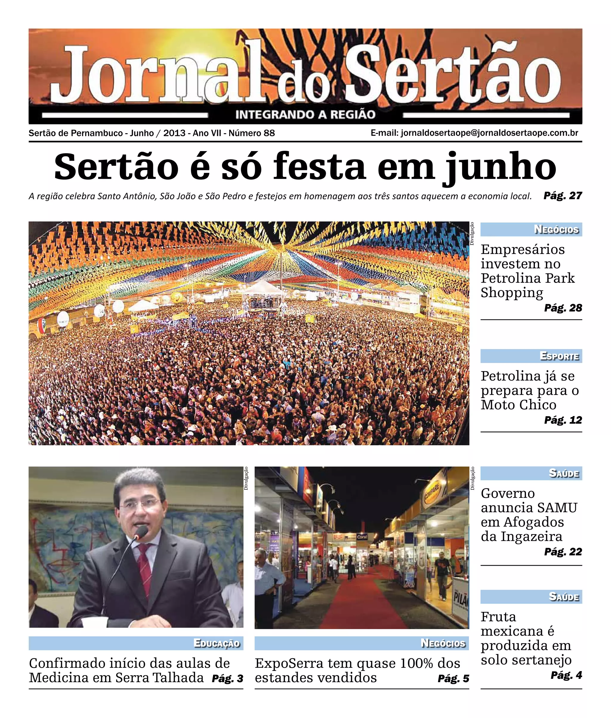 O jornal anuncia (1) o início das aulas de medicina em Serra Talhada para agosto, (2) a formalização de uma parceria entre a prefeitura e a Universidade de Pernambuco para disponibilizar estruturas municipais de saúde para o curso, e (3) os esforços do prefeito para captar recursos para a construção de um campus definitivo da universidade na cidade.