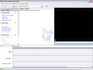 O documento descreve a história do cinema e dos irmãos Lumière, inventores do cinematógrafo. Também explica como usar o Windows Movie Maker para editar vídeos, adicionando imagens, música, efeitos visuais e salvando o projeto finalizado. A educação audiovisual é apresentada como uma possibilidade para motivar estudantes e diminuir evasão escolar.