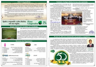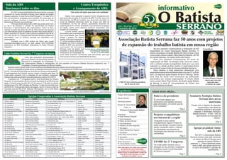 O documento descreve os planos da Associação Batista Serrana para comemorar seus 50 anos, incluindo a realização de cinco projetos evangelísticos em parceria com suas organizações filiadas. Além disso, menciona a abertura de novas matrículas no Seminário Teológico Batista Serrano e o primeiro congresso da União Feminina Missionária Batista Serrana.