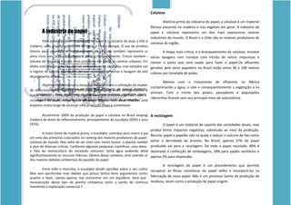 O documento discute a indústria do papel, seu impacto ambiental e a importância da reciclagem. Aborda a produção de papel a partir da celulose, os efluentes tóxicos gerados e a necessidade de reflorestamento. Também menciona os desafios da reciclagem do tetra pack e a importância dos catadores para o processo de reciclagem.