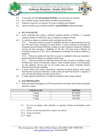 O Torneio de Ritualística Estadual Frank Arthur Marshall visa premiar Demolays ativos com base em suas habilidades ritualísticas e conhecimento, consistindo em avaliações teóricas e práticas em duas etapas: regionais e estadual. As inscrições são gratuitas e abertas a Demolays regulares, com um máximo de cinco participantes por capítulo. Prêmios em dinheiro serão oferecidos aos três primeiros colocados, e a competição seguirá critérios rigorosos de avaliação e desempate.