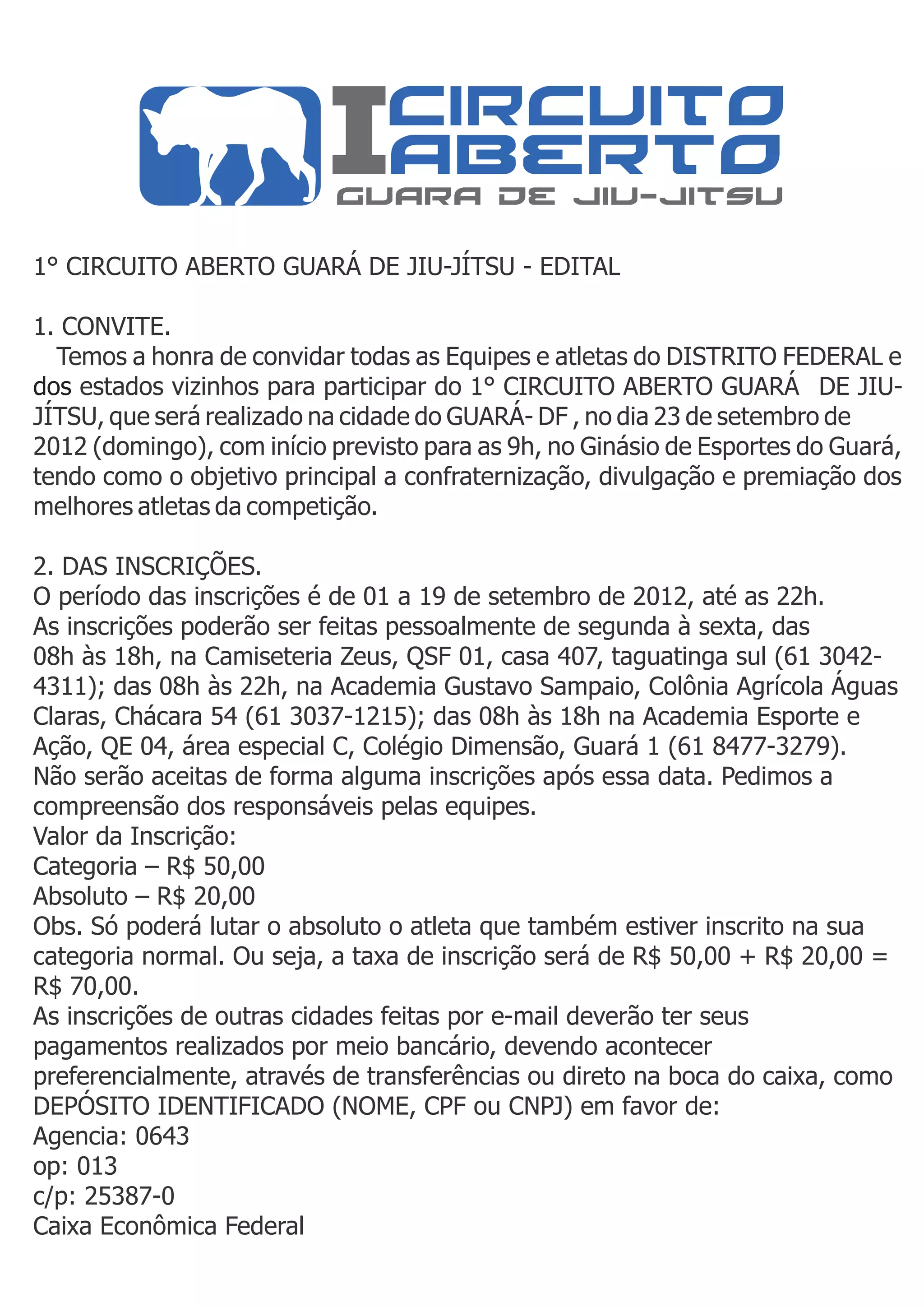 Este documento descreve o 1o Circuito Aberto Guará de Jiu-Jitsu, que ocorrerá em 23 de setembro de 2012 no Ginásio de Esportes do Guará. O circuito é aberto a equipes e atletas do DF e estados vizinhos e tem como objetivo a confraternização e premiação dos melhores. As inscrições ocorrem de 1 a 19 de setembro e há premiação para os campeões das categorias e absolutos.