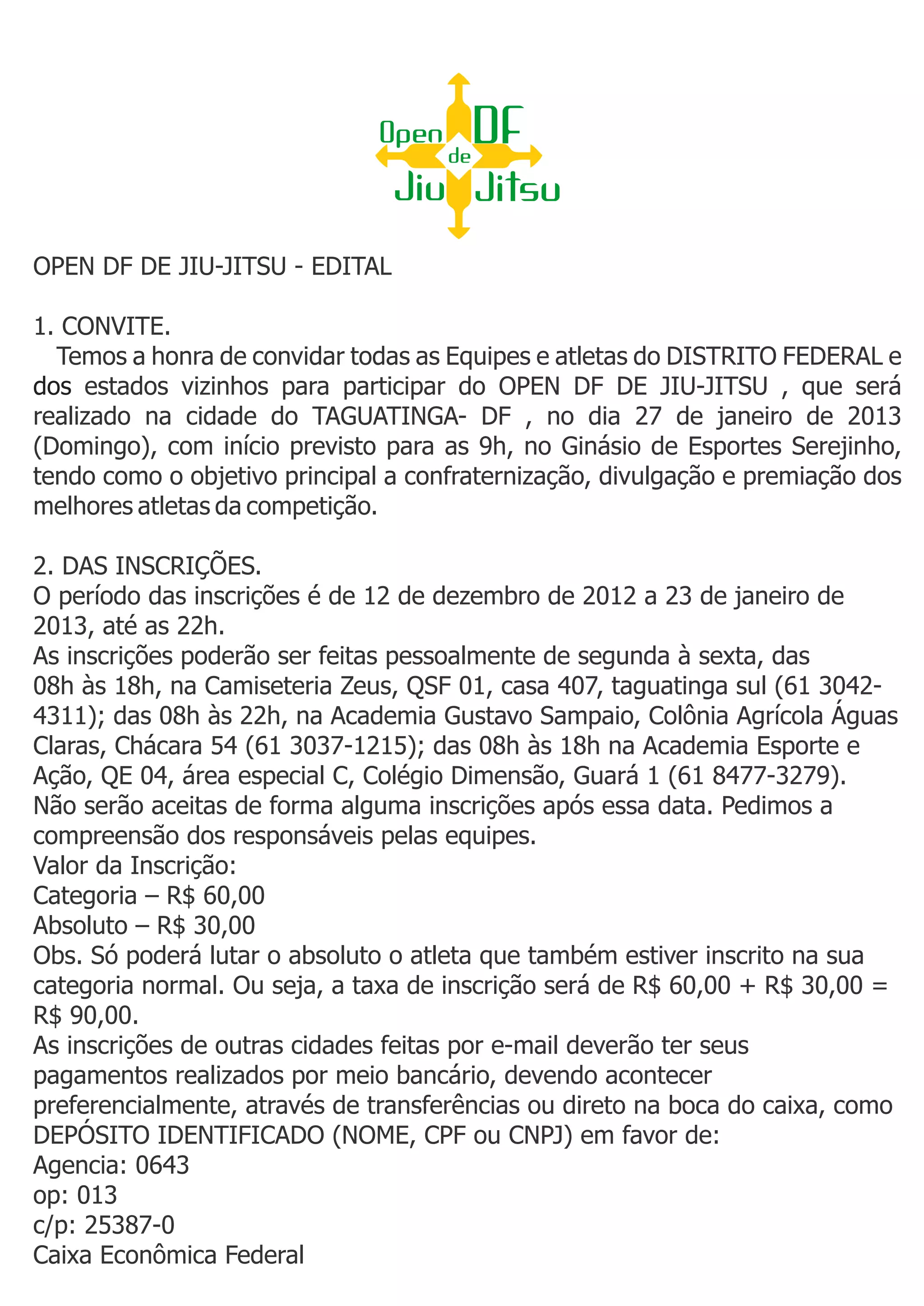 Este documento anuncia o Open DF de Jiu-Jitsu que ocorrerá em 27 de janeiro de 2013 em Taguatinga, DF. O evento é aberto a equipes e atletas do DF e estados vizinhos e terá disputas em várias categorias de peso do Jiu-Jitsu, com premiação para os vencedores. As inscrições podem ser feitas até 23 de janeiro e o cronograma completo do evento é descrito.
