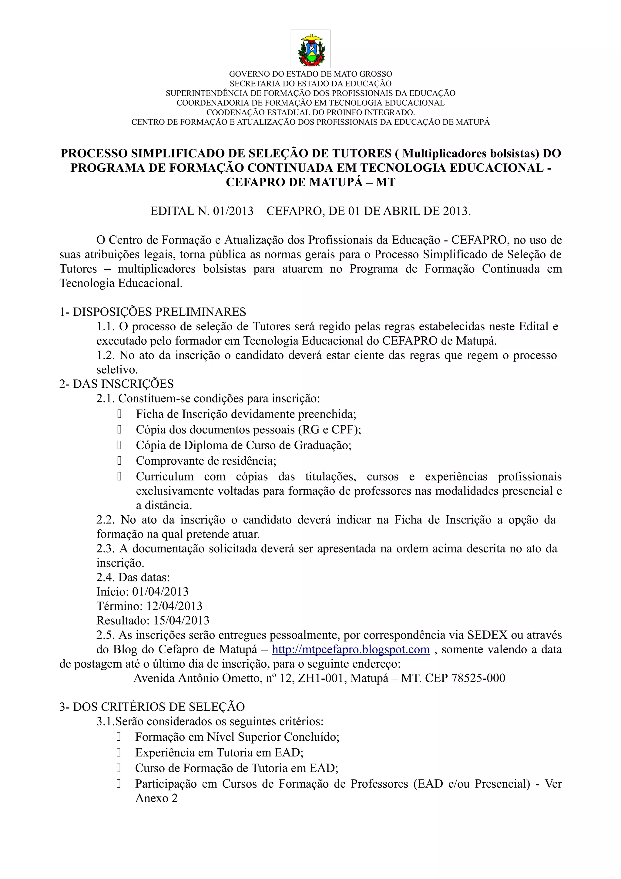 Este edital descreve o processo seletivo para tutores (multiplicadores bolsistas) no Programa de Formação Continuada em Tecnologia Educacional do Centro de Formação e Atualização dos Profissionais da Educação de Matupá (CEFAPRO). O processo seletivo irá selecionar tutores para três cursos com vagas limitadas. Os candidatos serão avaliados com base em critérios como formação, experiência e disponibilidade, e receberão bolsa de R$765 mensais se aprovados.