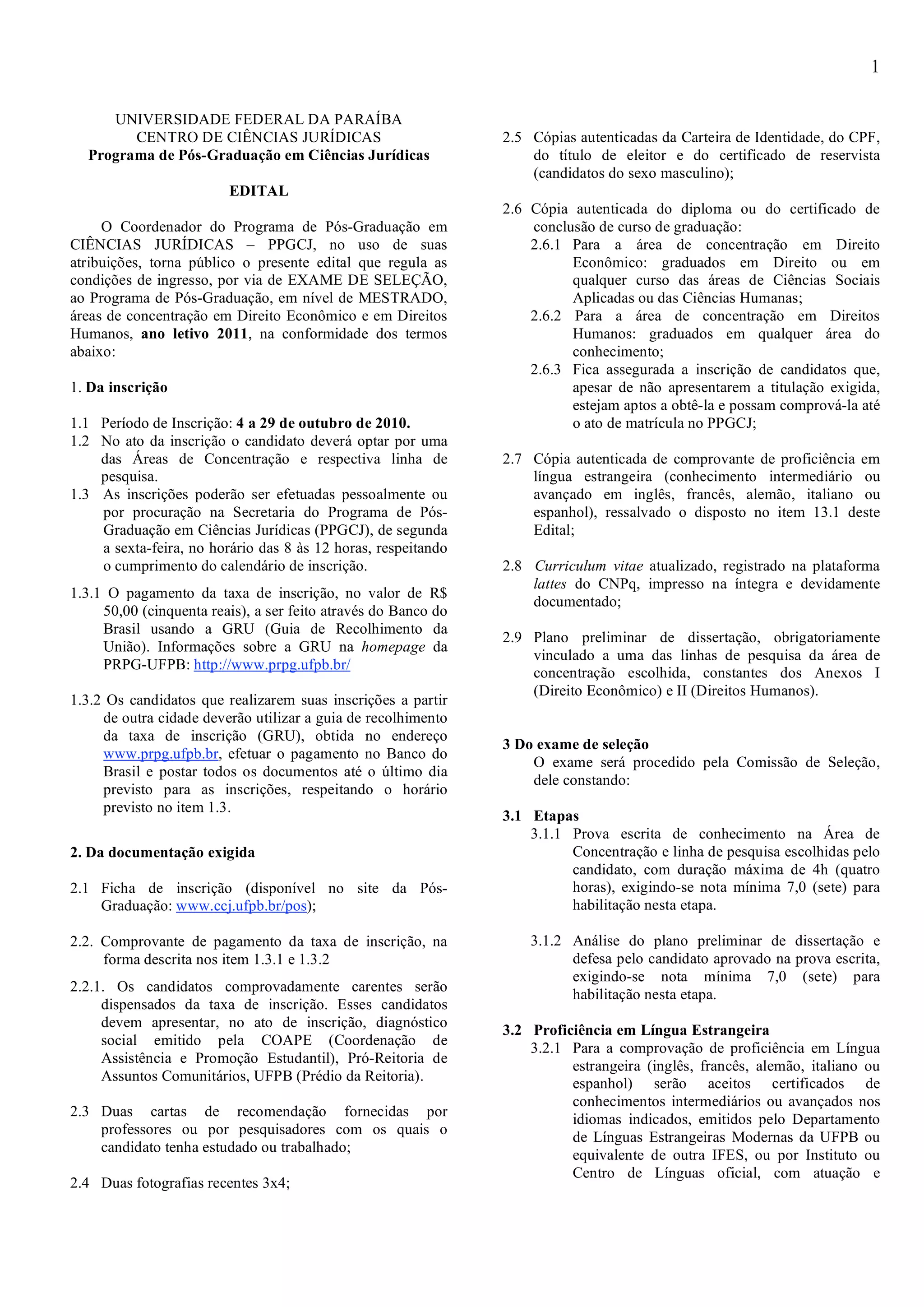 Este edital regulamenta o processo seletivo para o mestrado em Ciências Jurídicas na UFPB, com vagas nas áreas de Direito Econômico e Direitos Humanos. O processo seletivo consiste em prova escrita e análise e defesa de plano preliminar de dissertação. A seleção ocorrerá em novembro de 2010 e os candidatos deverão apresentar documentação comprobatória e pagar taxa de inscrição, podendo ser isentos mediante comprovação de carência.