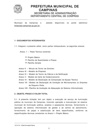 Este edital convoca licitação na modalidade menor preço para contratação de empresa para execução do serviço de iluminação pública do município de Campinas por 12 meses, incluindo operação, manutenção, fornecimento de equipamentos e sistemas de gestão. O valor estimado do contrato é de R$ 27,8 milhões.