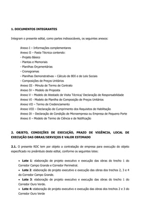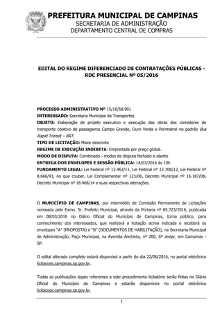 Este edital refere-se a uma licitação na modalidade Regime Diferenciado de Contratações Públicas (RDC) para a elaboração de projetos executivos e execução de obras de corredores de transporte coletivo em Campinas. O objeto é dividido em 4 lotes e a disputa será pelo maior desconto na modalidade combinada aberta e fechada. A abertura dos envelopes e sessão pública ocorrerá em 14 de julho de 2016.
