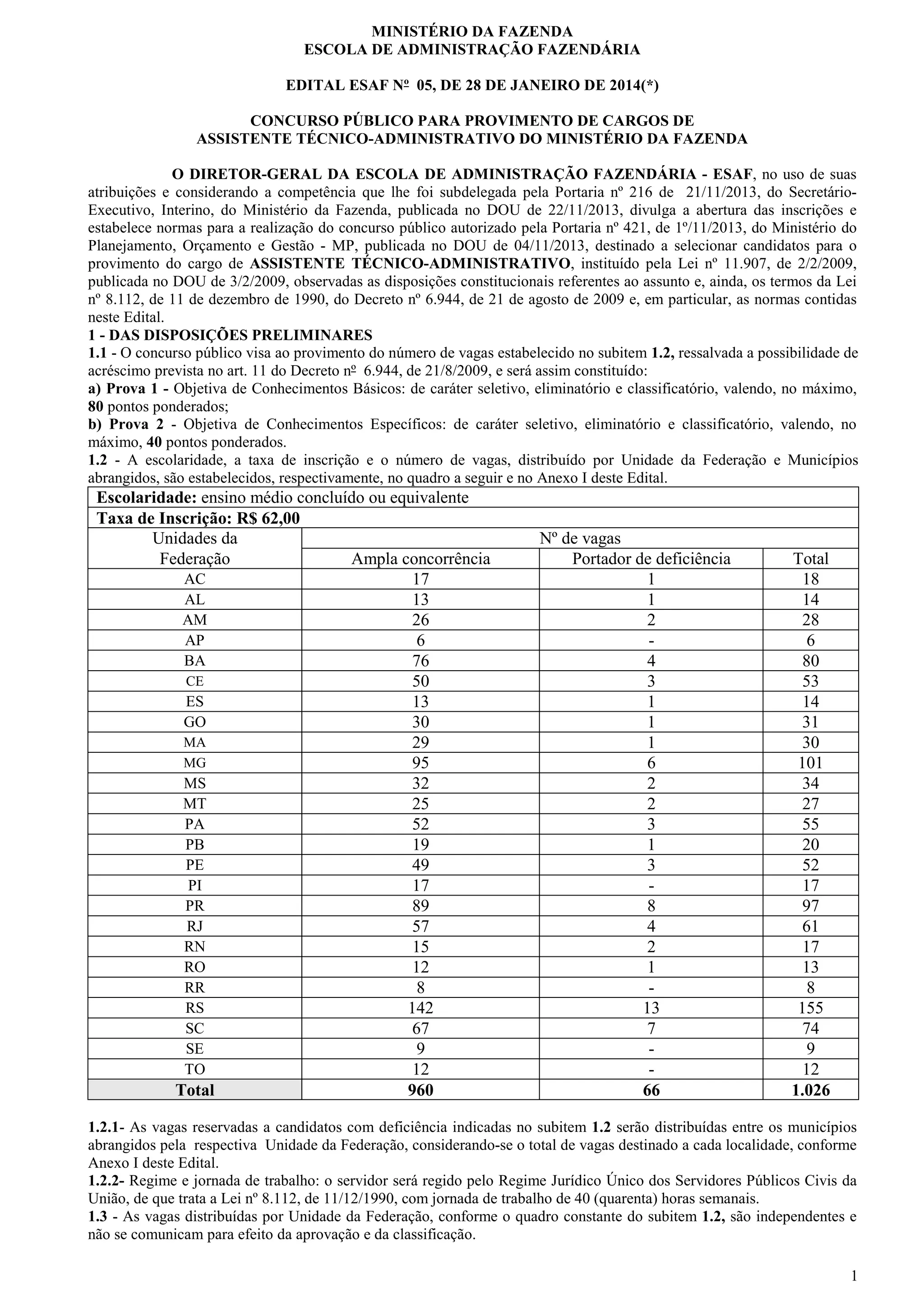 Este documento anuncia a abertura de inscrições para um concurso público para o cargo de Assistente Técnico-Administrativo do Ministério da Fazenda, com 1.026 vagas distribuídas por Unidades da Federação. O concurso consistirá em duas provas objetivas, uma de conhecimentos básicos e outra de conhecimentos específicos. Os candidatos devem ter ensino médio completo e pagar uma taxa de inscrição de R$62,00 até 16 de fevereiro de 2014.