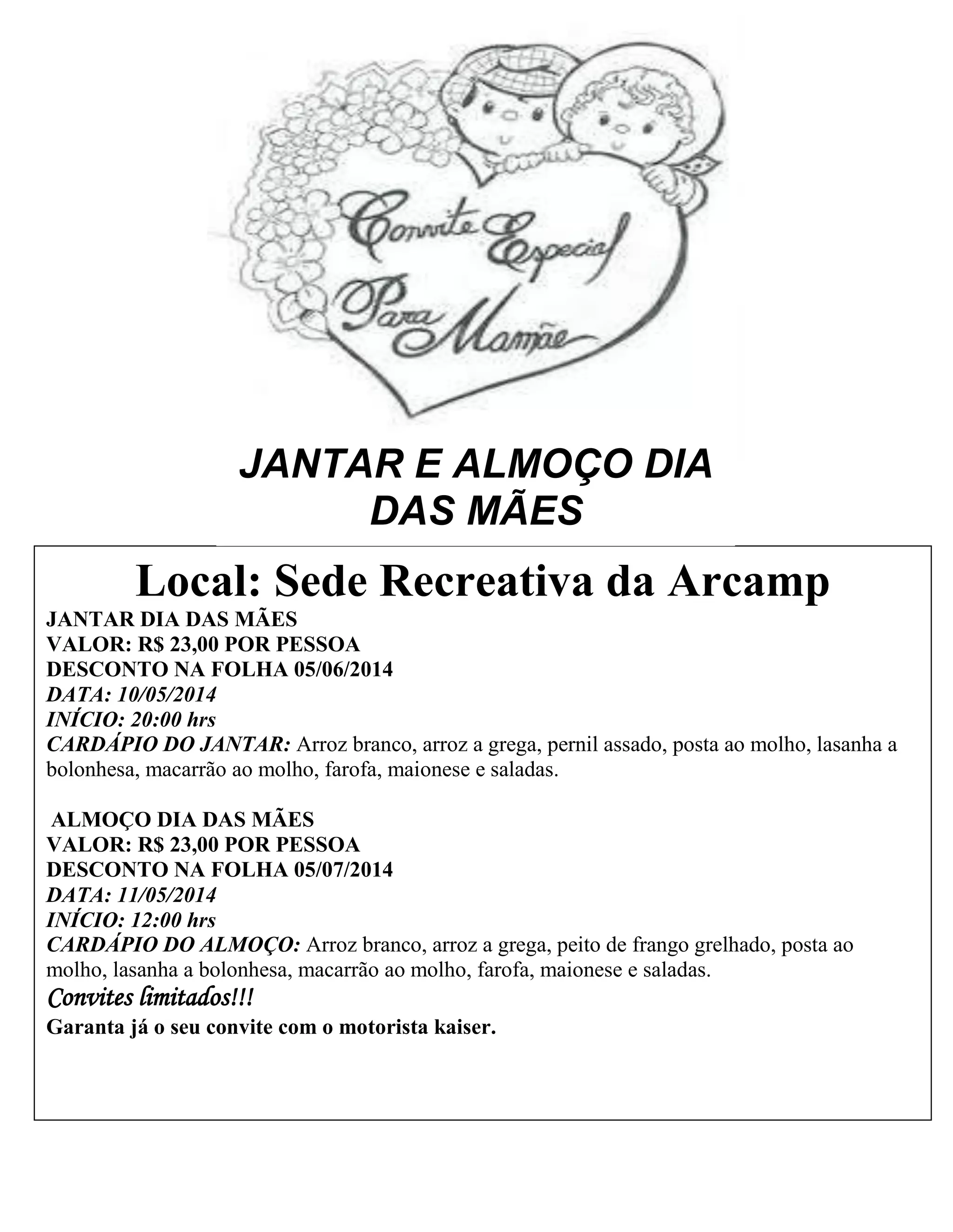 O documento anuncia um jantar e um almoço no Dia das Mães na sede recreativa da Arcamp, com cardápios semelhantes de arroz, carne e massas. O jantar será no dia 10/05 às 20h e o almoço no dia 11/05 às 12h, com convites limitados e desconto na folha para os funcionários.