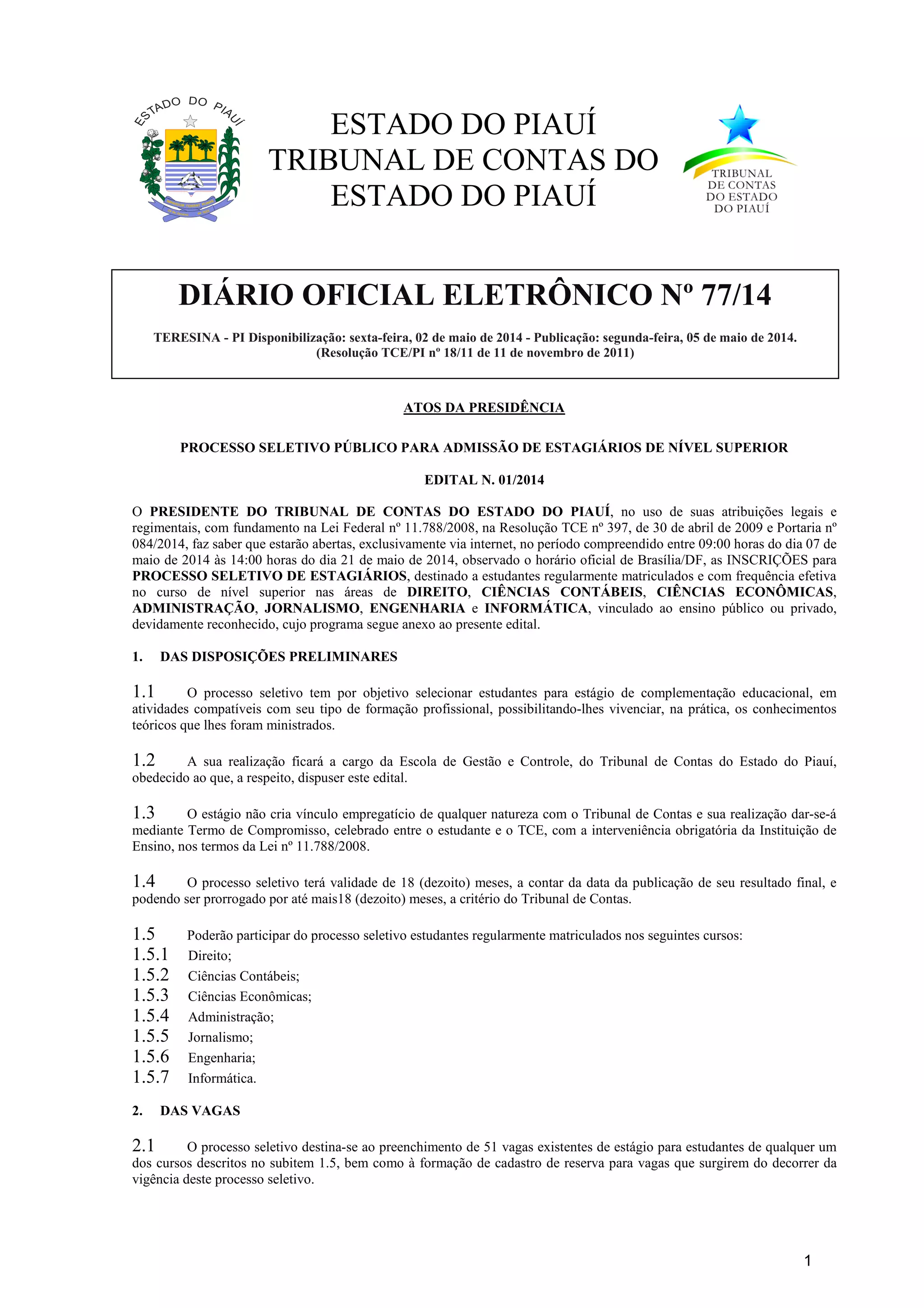 Este edital abre 51 vagas de estágio no Tribunal de Contas do Estado do Piauí para estudantes de Direito, Ciências Contábeis, Ciências Econômicas, Administração, Jornalismo, Engenharia e Informática. O processo seletivo consistirá em provas de português e conhecimentos específicos a serem aplicadas em 08 de junho. Os candidatos serão classificados por nota e os aprovados serão convocados de acordo com a ordem de classificação e necessidade do Tribunal.