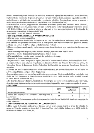 O documento anuncia um concurso público para preenchimento de vagas nos cargos de Técnico Administrativo e Técnico em Regulação da Atividade Cinematográfica e Audiovisual na Agência Nacional do Cinema (ANCINE). Serão oferecidas 57 vagas para Técnico Administrativo e 25 vagas para Técnico em Regulação, incluindo vagas para pessoas com deficiência. Os candidatos serão submetidos a provas objetivas eliminatórias e classificatórias e, se não eliminados, à perícia