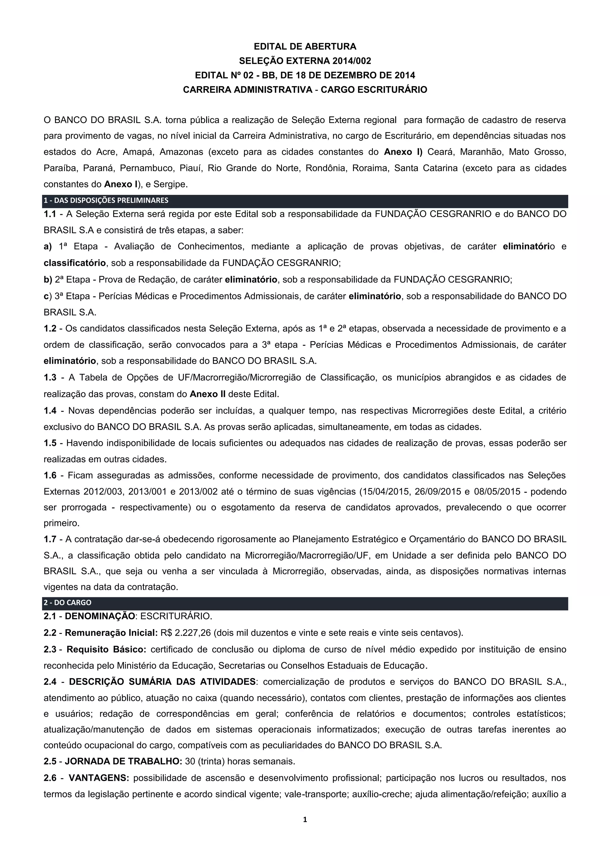 1) O documento anuncia uma seleção externa regional para o cargo de escriturário no Banco do Brasil em diversos estados brasileiros.