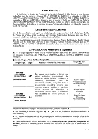 O documento anuncia um concurso público para o cargo de Assistente em Administração na Universidade Federal de São Carlos, com vagas nos campi de São Carlos e Sorocaba. O concurso terá inscrições entre 23/05/2013 e 24/06/2013 exclusivamente online, com taxa de R$70 a ser paga até 24/06. Haverá reserva de vagas para pessoas com deficiência.