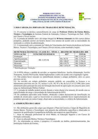 Este documento anuncia a abertura de inscrições para um concurso público para o cargo de professor no Instituto Federal do Pará, com vagas distribuídas em diversos campi. Define os requisitos para investidura no cargo, como nacionalidade, idade mínima, escolaridade exigida e aptidão física e mental. Também especifica a jornada de trabalho, remuneração, benefícios e atribuições do cargo.
