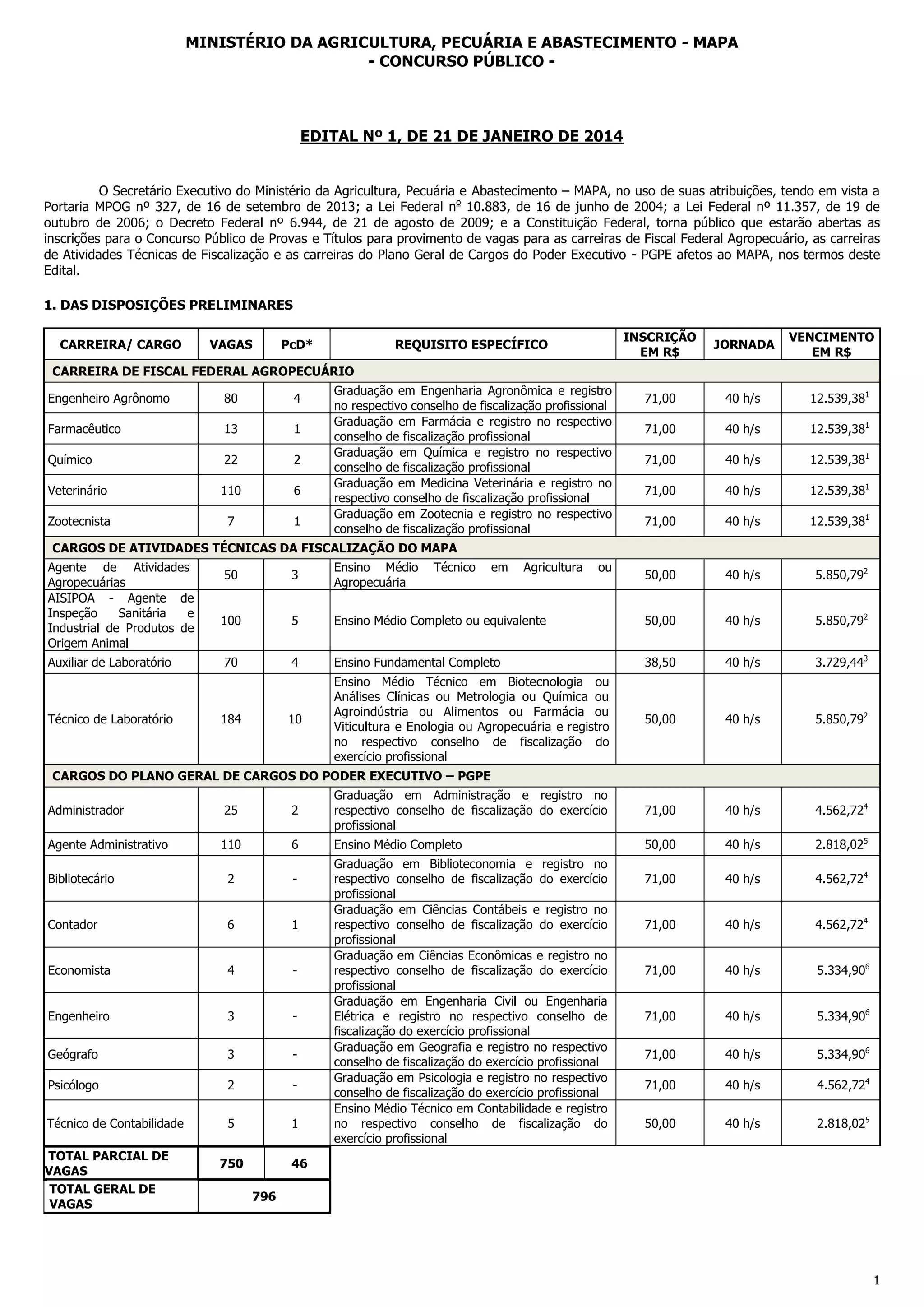O Ministério da Agricultura, Pecuária e Abastecimento abriu inscrições para concurso público com 796 vagas em diversos cargos. As vagas são para carreiras de fiscal federal agropecuário, atividades técnicas de fiscalização e cargos do plano geral de cargos do poder executivo. As provas serão realizadas em 27 capitais e as inscrições poderão ser feitas pela internet entre 3 de fevereiro e 6 de março de 2014.